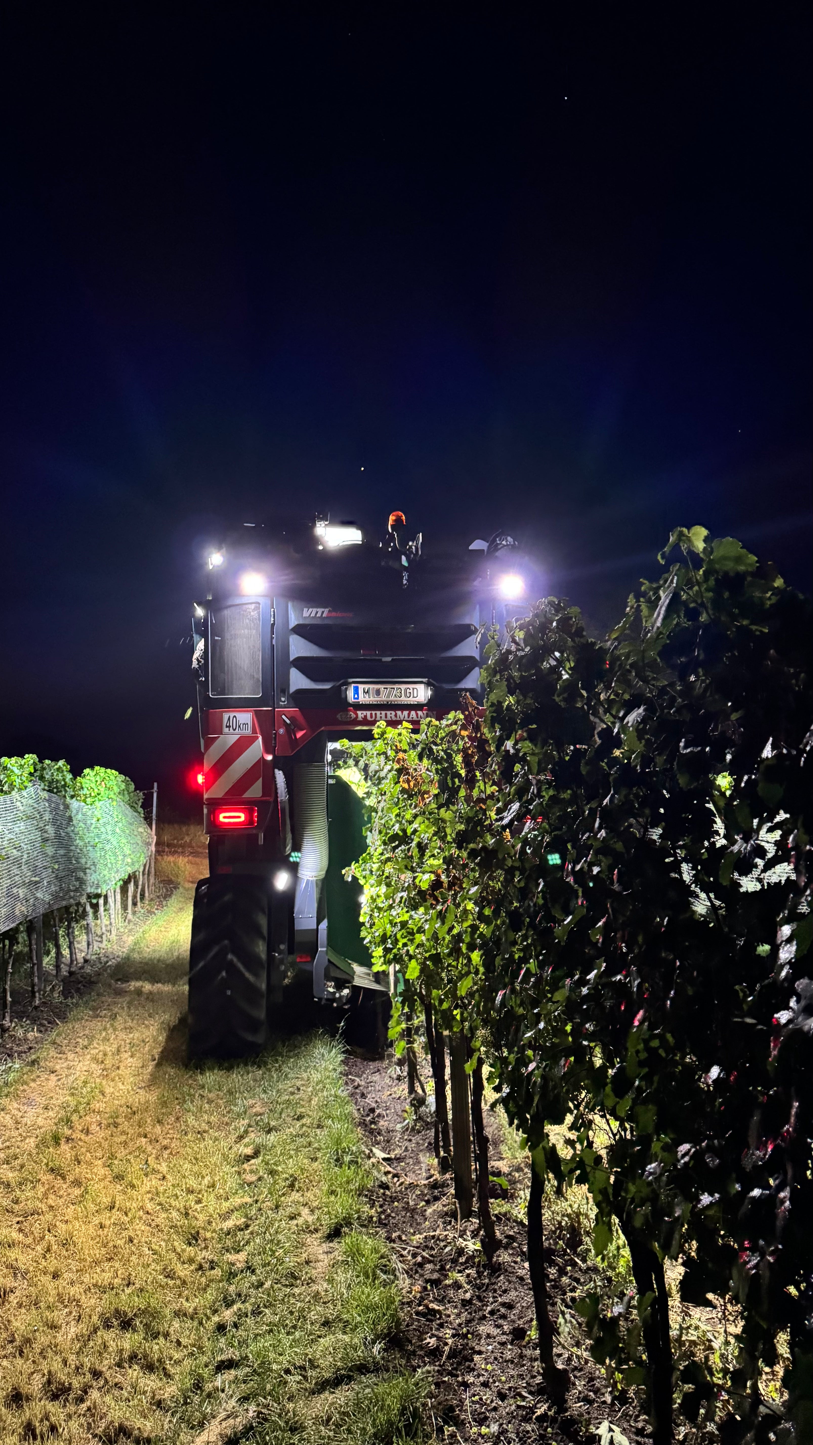 Um das volle Potenzial unserer Weingärten ausschöpfen zu können, ernten wir unsere Trauben überwiegend in der Nacht oder zeitig in der Früh.